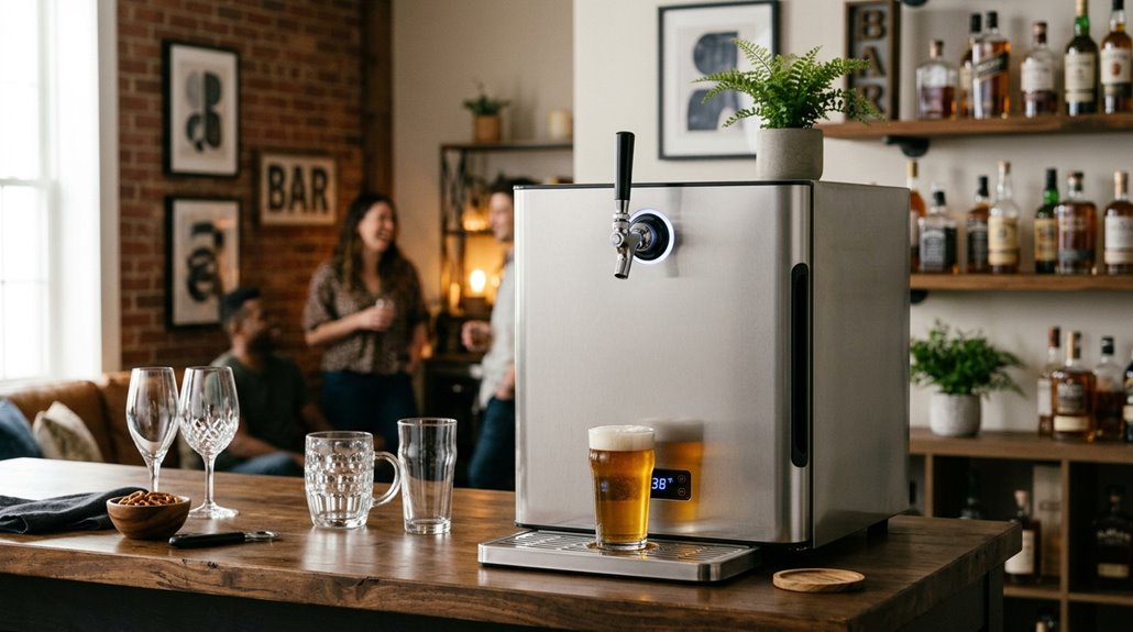 When choosing a kegerator, you’ll want to take into account factors like suitable keg sizes—smaller models for personal use, larger ones for parties—and how well the cooling system keeps your beer at the ideal temperature.